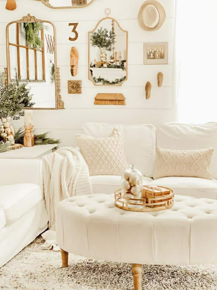 Winter whites, soft creams, warm taupes, and light grays create a timeless foundation. Layer linen slipcovers, chunky knit throws, and cotton ticking stripes to keep the space feeling inviting rather than cold.