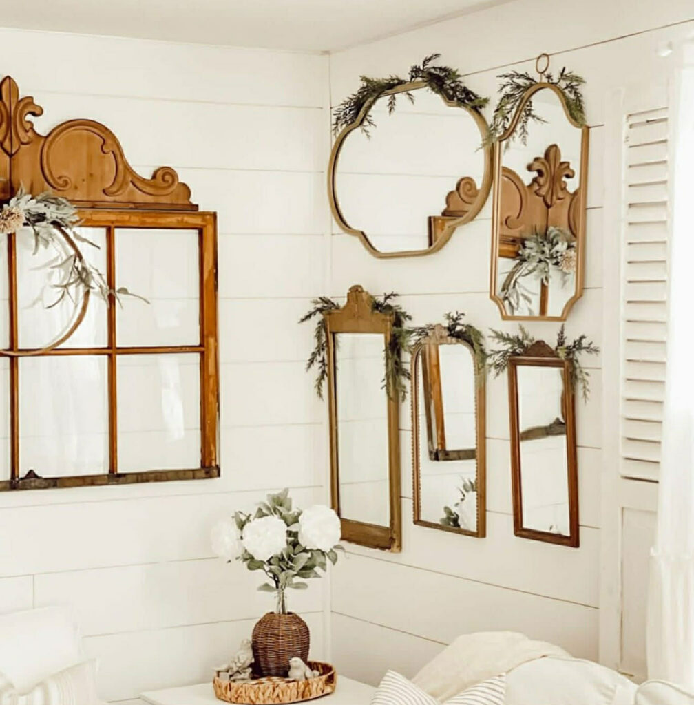 Swap Christmas garlands for eucalyptus, olive branches, or dried boxwood placed in vintage containers. A single branch in an antique crock is often more powerful than a full arrangement.