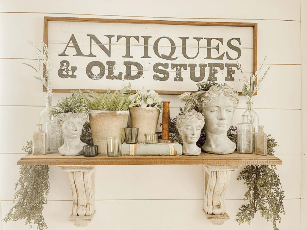 This is where the farmhouse truly shines. Antique dough bowls, ironstone pitchers, vintage crocks, and wooden cutting boards add soul instantly. An old stool beside the fireplace or a weathered bench in the entry adds history without trying too hard.